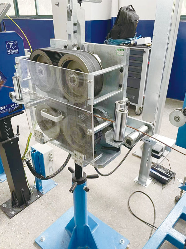 履带式高精度计米器是用来计量电缆等介质长度的专用设备。履带式计米器是通过上下两根履带将测量介质夹住后一起拖动。履带行走的长度就是被测量介质的长度。履带行走的长度就是履轮转过的节线的长度,也就是履轮节距与牙数的乘积。通过安装在主动履轮轴上的编码器来测量履轮转过的圈数,经过换算就可以得出通过介质的长度,并记录下来。上部履带通过手轮与丝杆来上下升降,下部履带通过气缸来上下升降。升降的距离以被测量的介质的外径来决定。