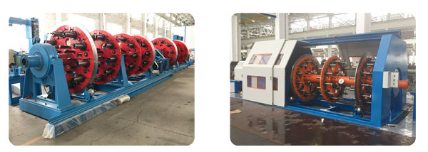 绞笼上的放线为有轴式结构,张力采用机械式摩擦带结构,张力大小可调;线盘锁紧采用弹簧插销锁紧,并有止退功能;绞笼主轴为一根整轴,根据线盘数量的多少采用双支撑或三支撑结构,并有不转动的中心护线管以保护电缆外表面不被擦伤;设有断丝和丝完停车装置。